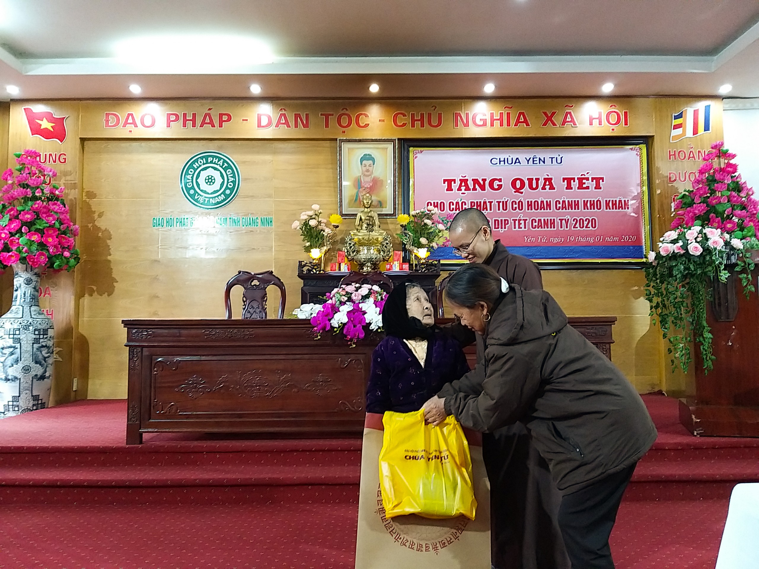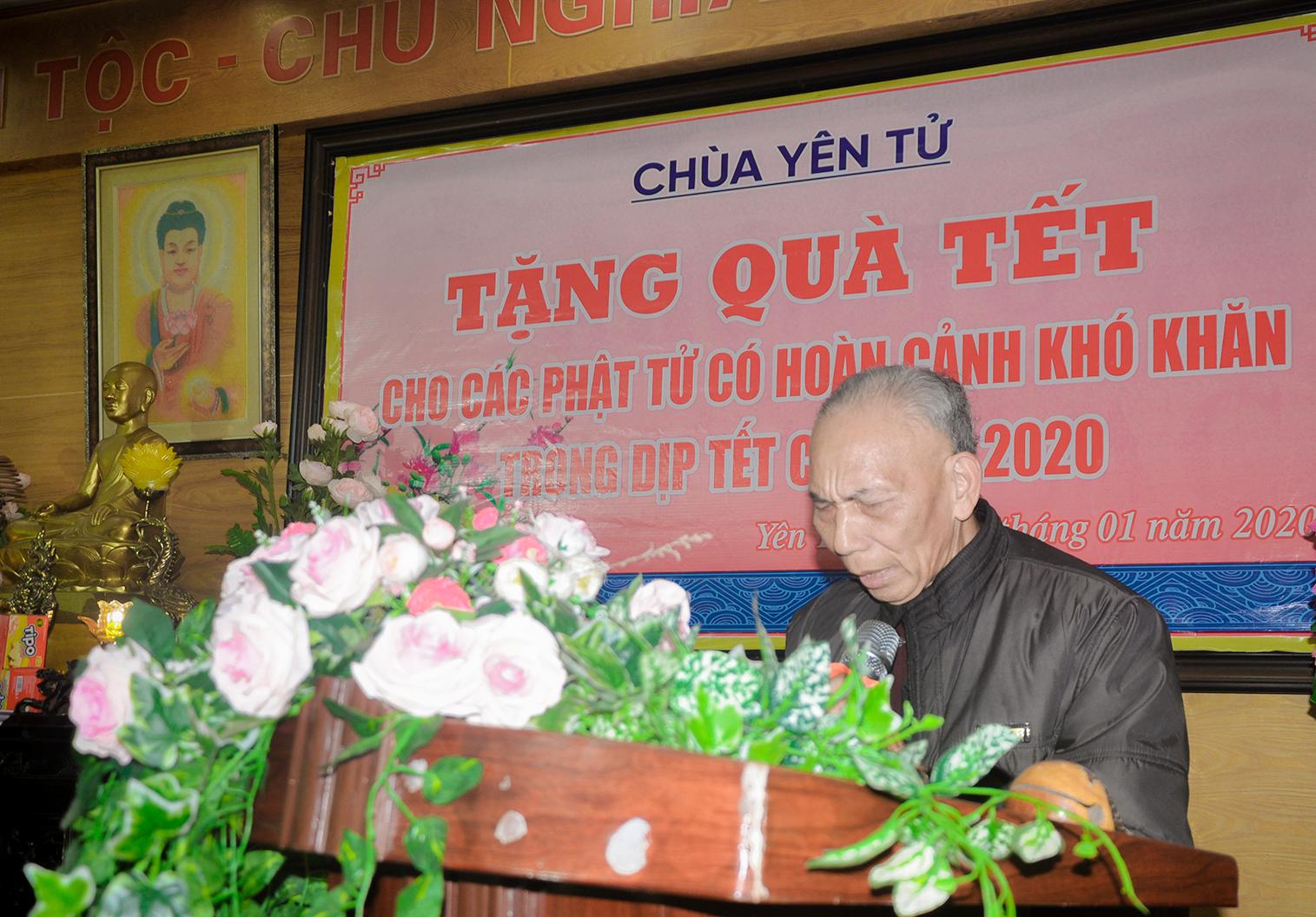 Chứng minh và tham dự buổi trao quà có Thượng tọa Thích Đạo Hiển, Ủy viên HĐTS, Phó Trưởng ban kiêm Chánh Thư kí BTS GHPGVN tỉnh Quảng Ninh. Chia sẻ trước buổi trao quà, Thượng tọa đã tán thán công đức của Tăng Ni, Phật tử chùa Yên Tử và gửi lời chúc tốt đẹp đến các gia đình Phật tử. “Thay mặt Ban Trị sự, tôi xin tán thán công đức của Chư Tăng Ni, Phật tử chùa Yên Tử. Phật dạy “Từ, Bi, Hỷ, Xả”, trong đó, Từ Bi là khởi được lòng thương yêu và cứu giúp mọi người vơi bớt những khổ đau, thêm phần an vui, hạnh phúc. Ca dao tục ngữ Việt Nam có câu “Lá lành đùm lá rách”, “Bầu ơi thương lấy bí cùng, Tuy rằng khác giống nhưng chung một giàn.” Đó là truyền thống nhân văn, nhân ái của người Việt. Mỗi dịp Tết đến xuân về, gia đình đoàn viên, ai cũng mong được nghỉ ngơi, no đủ. Nhưng đâu đó quanh đây vẫn còn những gia đình có hoàn cảnh khó khăn, hoặc thiếu thốn vật chất, hoặc người già cả neo đơn, hoặc những hoàn cảnh riêng khác… Chúng tôi rất xúc động khi hôm qua, nhà chùa cùng với hội từ thiện vừa trao quà Tết cho bệnh nhân nghèo ở bệnh viện tỉnh, hôm nay lại trao quà tết cho gia đình Phật tử có hoàn cảnh khó khăn ở trên địa bàn. Phần quà của nhà chùa tuy nhỏ thôi nhưng mang ý nghĩa động viên tinh thần, sẻ chia yêu thương tới những người kém may mắn hơn mình. Thay mặt chư Tăng, tôi xin kính chúc toàn thể quí vị và gia đình có một cái tết ấm cúng, đoàn viên, an vui và hạnh phúc!” – Thượng tọa chia sẻ.