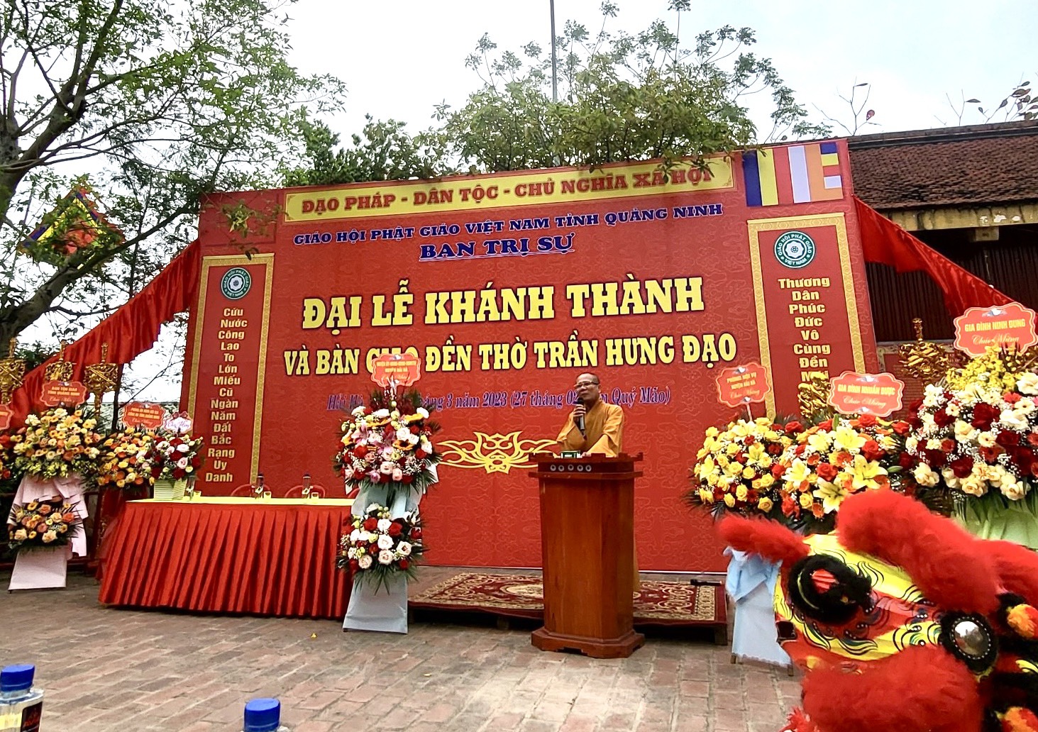 Thượng tọa cũng tán thán công đức của Đại đức Thích Khai Hỷ - Trưởng ban xây dựng đền Trần Hưng Đạo. Trong quá trình triển khai xây dựng, Đại đức vừa phải theo học tại Học viện Phật giáo Việt Nam, vừa phải đảm trách việc xây dựng, huy động các nguồn lực, lại gặp phải 3 năm đại dịch Covid-19 hoành hành, kinh tế khó khăn. Tuy vậy, công trình vẫn hoàn thiện uy nghiêm và tố hảo trong niềm hoan hỉ của toàn thể nhân dân, Phật tử huyện Hải Hà.