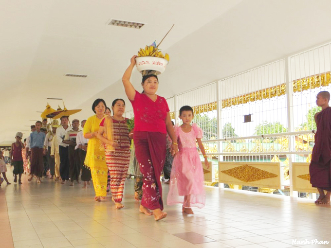 Người dân Myanmar đi hành hương rất đông vào tầm giờ chiều. Họ mặc trang phục truyền thống, đầu đội những mâm đồ cúng lễ và đi thành từng đoàn già trẻ lớn bé.